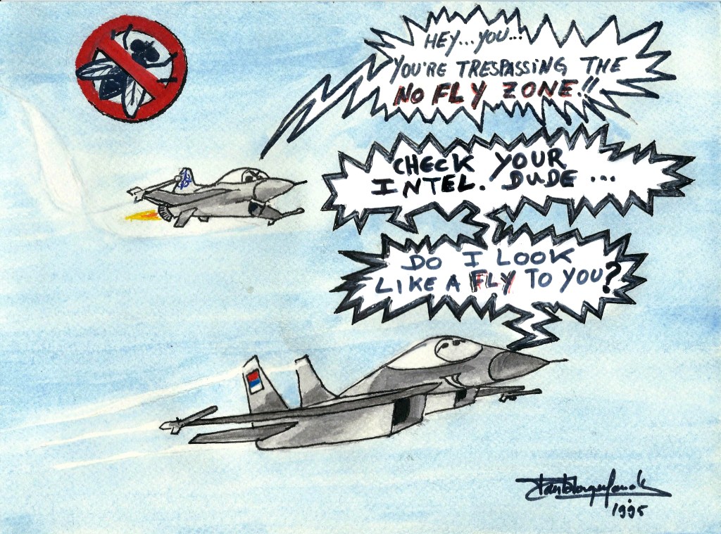 A terminologia “No Fly Zone” era alvo de menções jocosas e trocadilhos brincalhões, uma vez que a palavra “Fly” (em Inglês) é a mesma para “voo” e para “mosca”. Desta forma, No Fly Zone poderia ser traduzido por “Zona Interdita a Moscas” (ou a insectos voadores).
