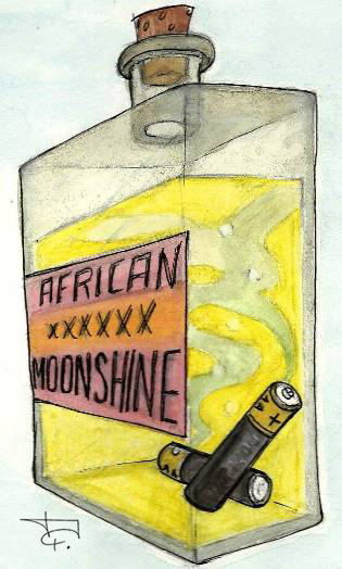 – “Tché … – exclamou ele – consigo, consigo! Abro-as com uma catana e meto-as dentro de um panelo com fruta e farelo de milho a fermentar, para fazer a caxipembe. O ácido das pilhas apressa as coisas e amanhã o caxipembe já está pronto para eu vender no bazar!”