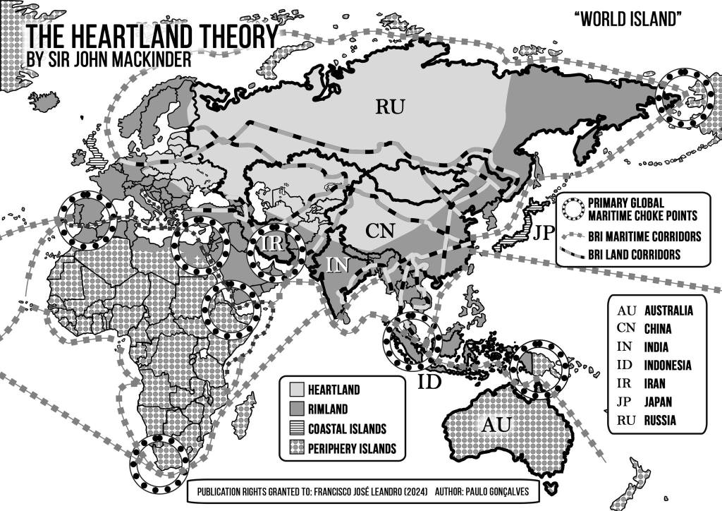 A Teoria do Heartland de Halford Mackinder (1904), foi um pilar da geopolítica clássica, que postula que a região central da Eurásia — o “Heartland” — é a chave para o domínio global. Mackinder argumentou que o controle dessa área rica em recursos, sem saída para o mar e em grande parte inacessível ao poder marítimo, permite que um Estado domine a “Ilha Mundial” (Eurásia e África) e, consequentemente, o mundo. Agora junte-se o “Belt and Road” de Xi Jinping … et voilà!