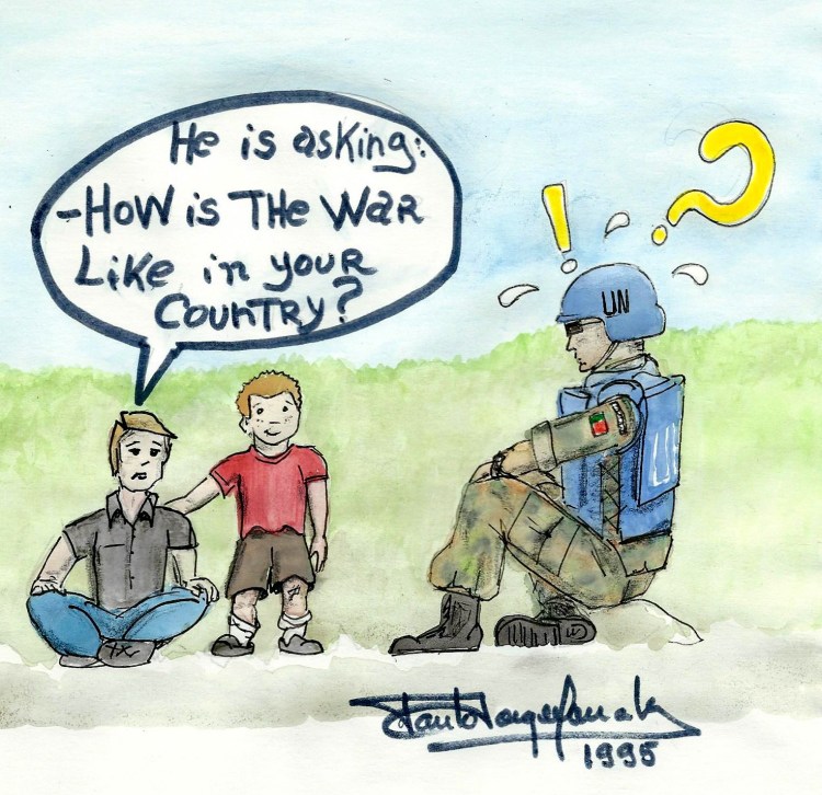 Na outra ponta da Europa, em Lisboa, eu tinha um outro miúdo um pouco mais novo e fiquei impressionado com a situação, ao ponto de ter desenhado este (acima) cartoon para exprimir o que sentia. Este desenho acabou por dar a volta ao Mundo, uma vez que os mesmos camaradas Capacetes Azuis pensavam exactamente o mesmo que eu, e usaram-no também para complementar o velho Grego:- “Os velhos decidem fazer a Guerra mas são os jovens que morrem a combatê-la” … e as crianças que lhe sobrevivem ficam marcadas para a vida!